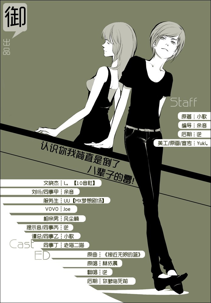 但是因为罩着原著滴光环!俺有幸参与了选角!并且居心叵测地钦点了余音傻吗!(潜规则神马的,你们懂的- -*),于是余音傻吗便当仁不让滴成为了鞭具+导演+主声优(当然将来还会变成原著滴暖床妹yahiahiahiahiahiahia~~~-v-*),然后小逆傻吗用她那甜到完全好像从蜜缸里捞出来的嗓子嚎叫着自己是T,于是被众人秒杀= =,不过她还是灰常人尽其用滴担任了后期制作和主题曲演唱滴工作~~